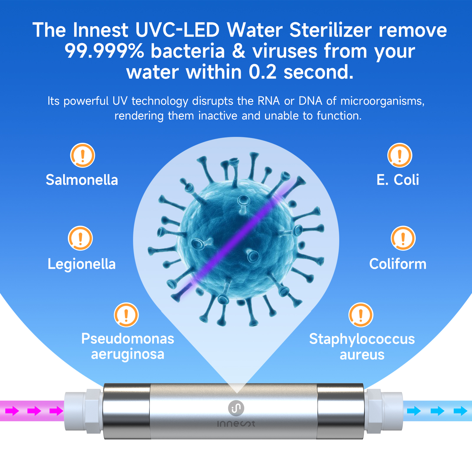 随着全球对用水安全关注度的不断提升,Innest始终致力于为家庭与商业用户提供可靠、科学的水净化技术解决方案。我们自主研发的UVC-LED水杀菌技术能够输出45 mJ/cm² 的精准紫外线照射剂量,可对多种微生物实现高效消杀。