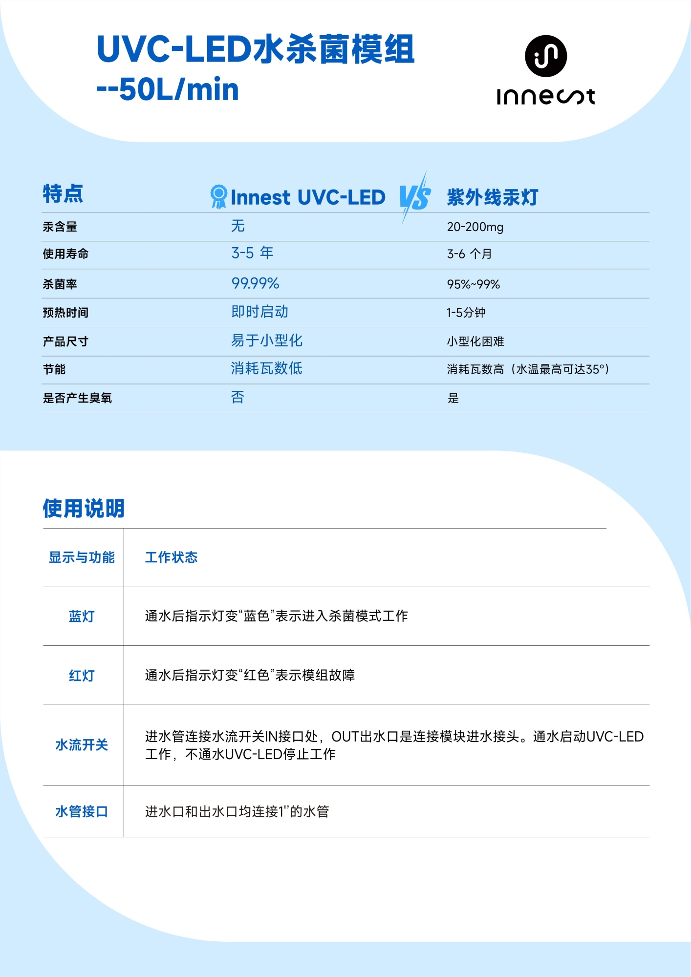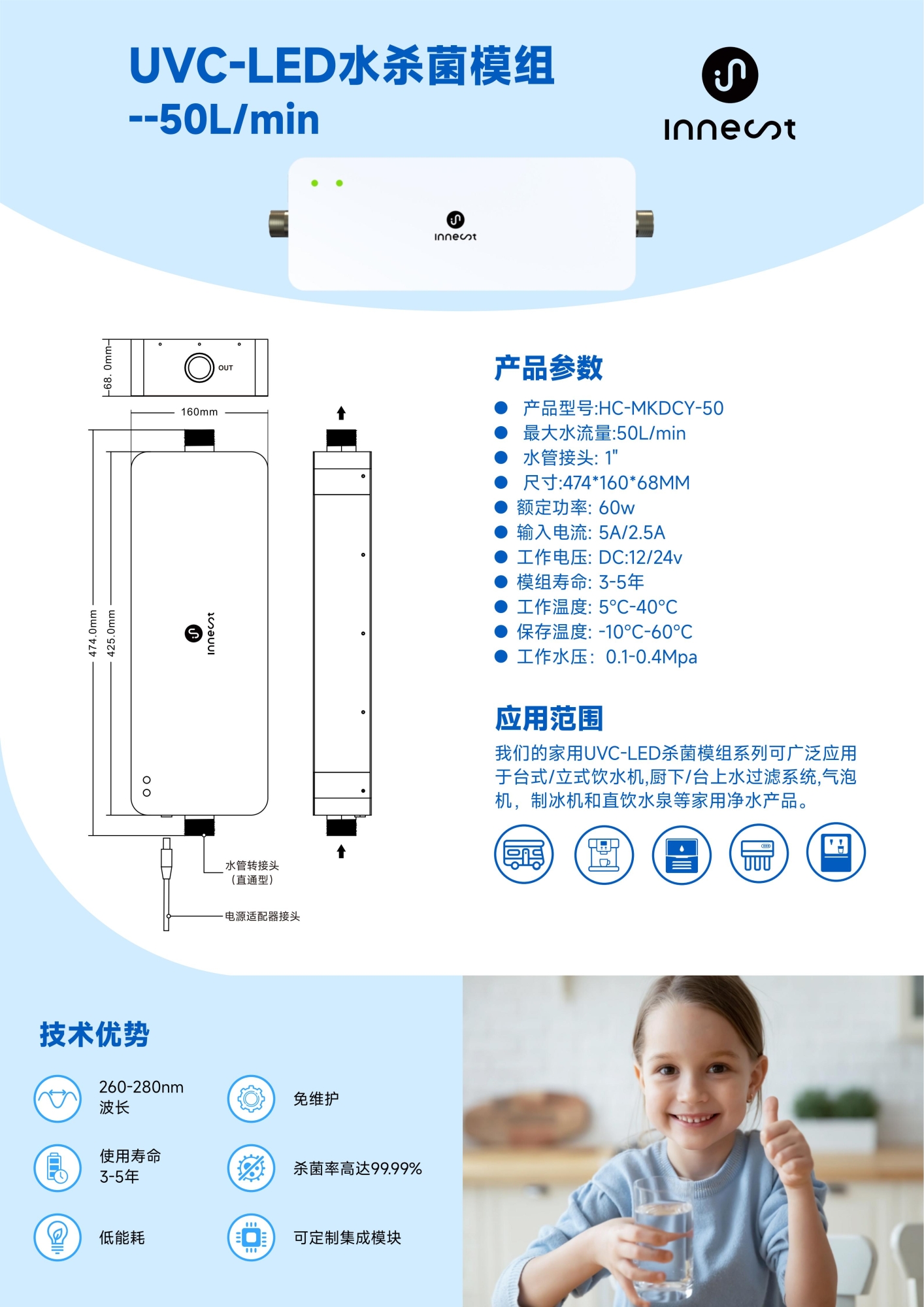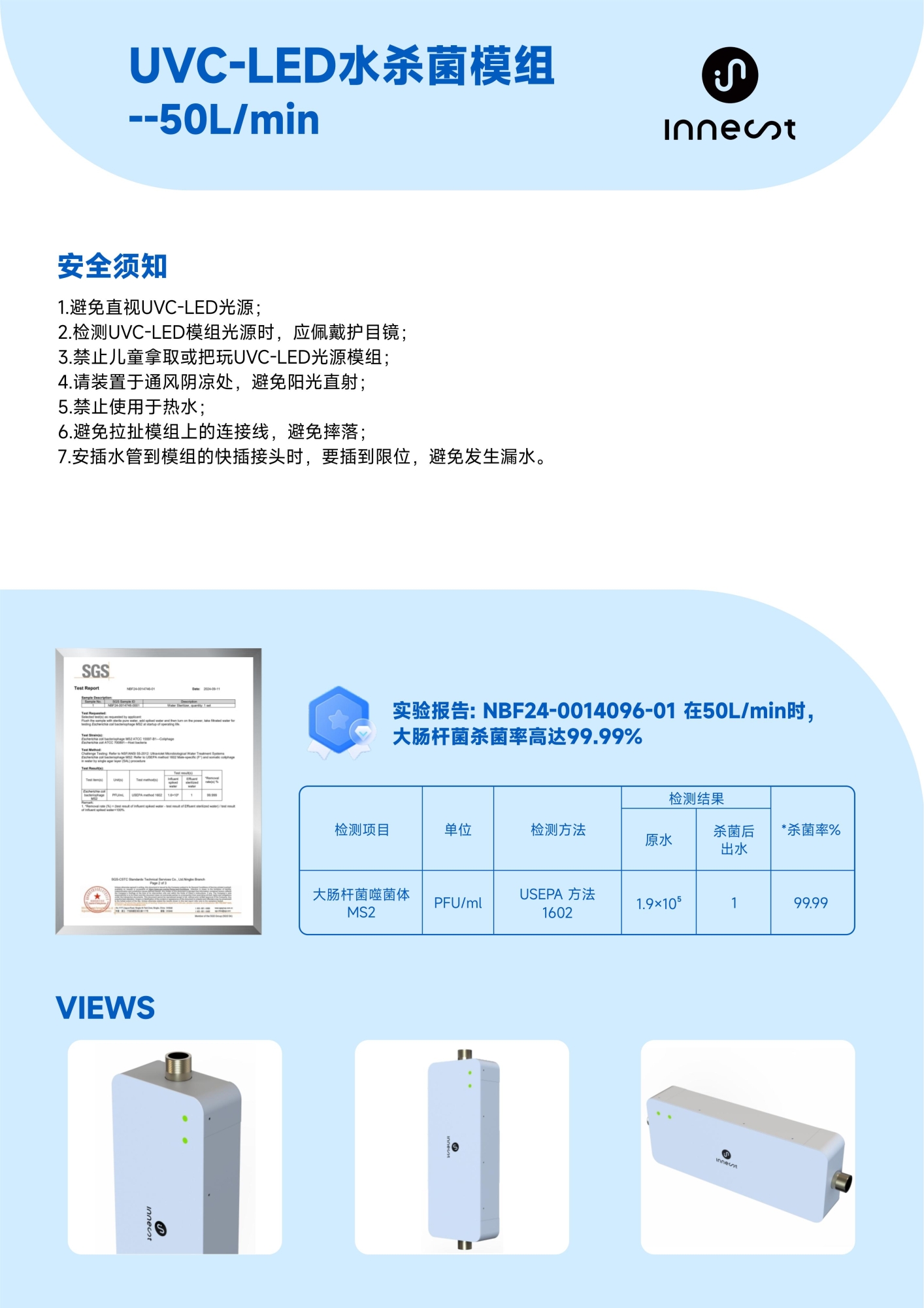 该模组支持50–75L/min大流量处理能力,可满足全屋多点用水需求。同时,依托先进的UVC-LED技术,实现0.2秒内极速消杀,高达99.999%的细菌和病毒灭活率,无需化学添加,即开即用,安全高效。
